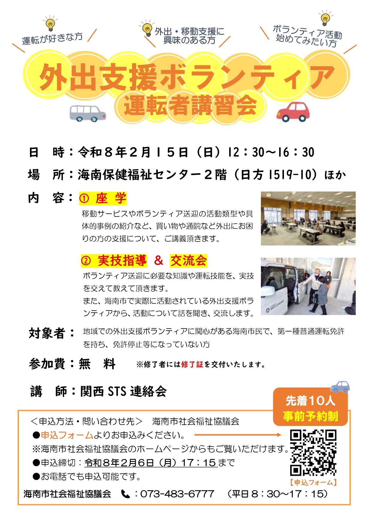 | 対 象 | 地域での移動支援ボランティアに関心がある海南市民で、第一種普通運転免許を持ち、免許停止等になっていない方 |