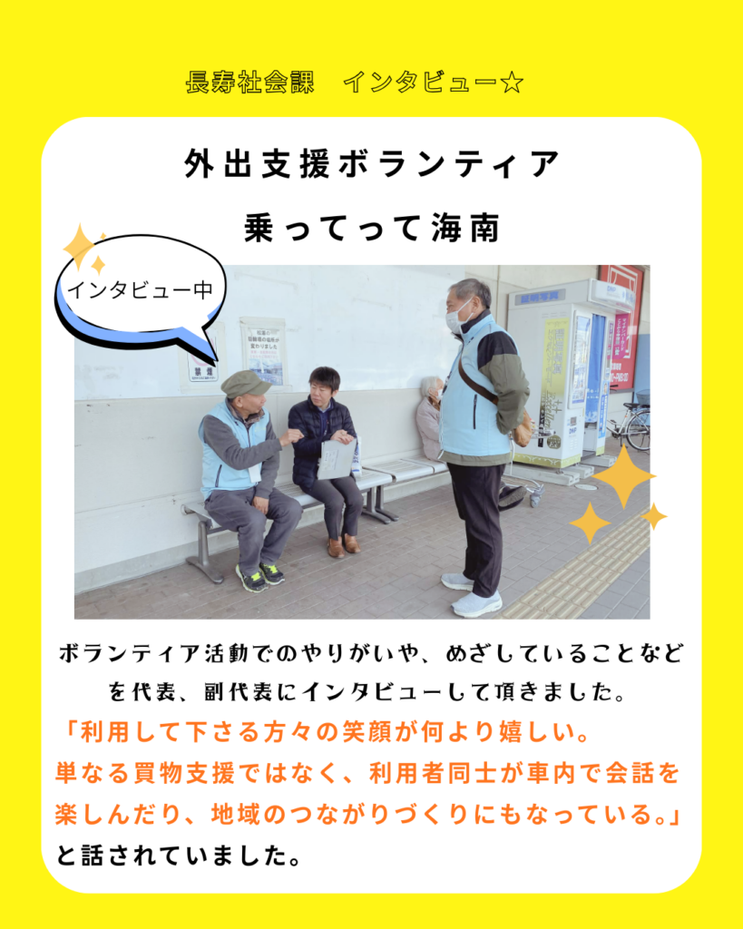 活動について詳しくインタビューして下さり、日々のボランティア活動について改めて振り返る良い機会になりました。