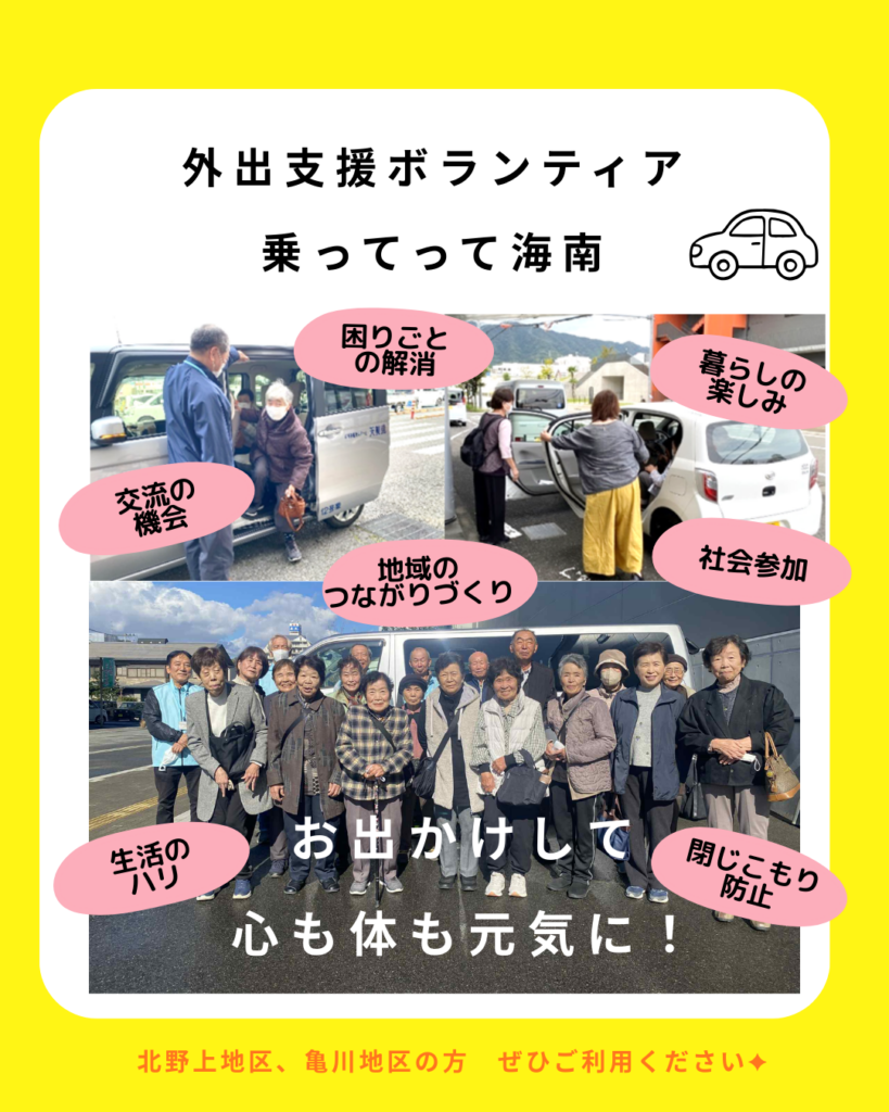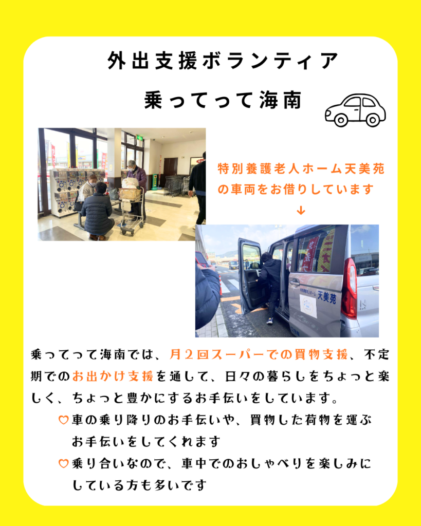 R8.2.12(木)和歌山県長寿社会課の方が、外出支援ボランティア「乗ってって海南」の活動を見に来て下さいました。本日は5名の方の利用があり、ご自宅からスーパーまでの送迎を含めて、車の乗り降りのお手伝いや、荷物を車に積み込んだり玄関先まで運ぶなどの買物支援をしてくれました。 |
